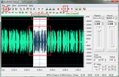 另外,如果熟悉计算机操作的话(其实也必须熟悉才对),还可以找一些音频编辑软件作为辅助工具,如 Cool Edit,Audio Edit Deluxe,Audacity 等等。这些软件对用户来说相当于 “音频视觉化”,可以通过音频图谱清楚地看到语音之间的空隙、音量的大小强弱等等。并且,用它们很容易做到把某一段音频(比较精确地定义起点和终点)反复播放无数遍。