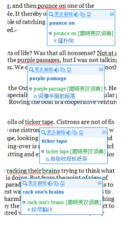尽管《金山词霸》从来都不是令人满意的产品,但确实还是有可取之处的。其中最受用的是它的 “词组自动识别” —— 金山公司自己并未大张旗鼓地宣传的一个功能。看看下面的图片就知道这个功能有什么用了。