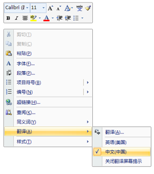 MS Word 从 2007 版本开始内嵌了 “鼠标取词” 功能。其所采用的词典是权威的《美国传统词典》的英汉版本,释义详实,例句丰富。“默认安装” 的情况下,鼠 标取词功能并未设置为开启状态,需要用户手动开启 —— 在鼠标右键的快捷菜单中选择 “翻译”,而后选定 “中文(中国)”: