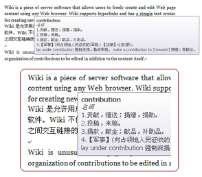 这个词典是英汉、汉英双向的。在文档中选定一个中文词汇,而后在选中的区域使用 “Alt + Left Mouse” 快捷键,右侧就将显示该中文词汇的英文释义。