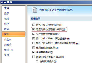 如果用户安装的是 MS Office 中文版,那就可能需要设置一下才可以在文档中通过鼠标左键双击自动选中整个英文单词(“Word 选项”->“高级”->“选定时自动选定整个单词(W)”):