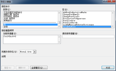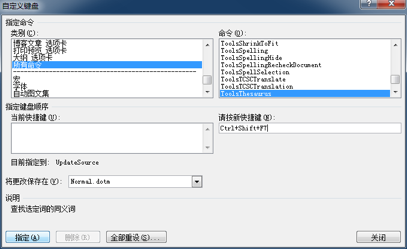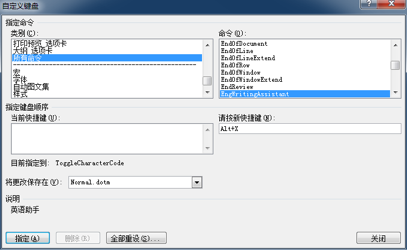 其实很简单,方法与上文中 “为同近义词查询对话框添加快捷键” 是一样的。只不过,这次要为 “EngWritingAssistant” 命令添加快捷键。我一般习惯于使用 “Alt+X” 这个在 MS Word 尚未被定义的键盘组合。