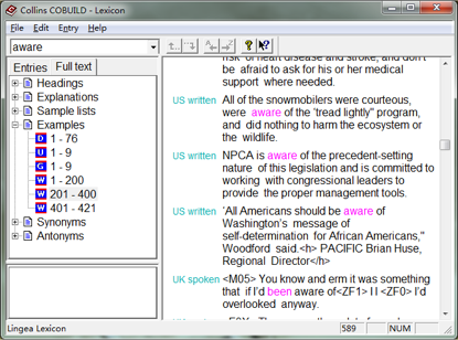 柯林斯(Collins)词典也是市面上唯一一个自带可查询语料库的词典。查每个单词的时候,释义中有相应的例句之外,在 “Full text” 标签里有个 “Examples”,通常都有几十个甚至几百个例句,其中的例词被红色高亮,并且在例句之前标注了究竟是 UK written、 UK spoken、US written、US spoken 之中的哪一种。“Example” 之下有若干个图标,其中:
