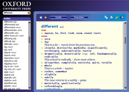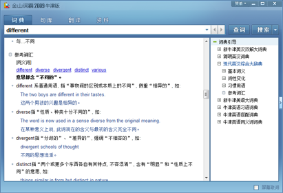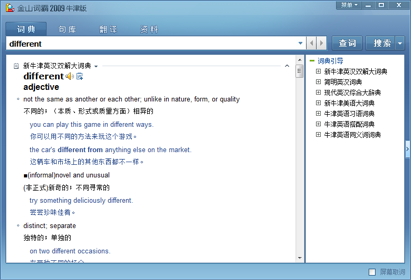 比如,金山词霸里有《新牛津英汉双解大词典》,用它查询 “different” 这个词结果如下: